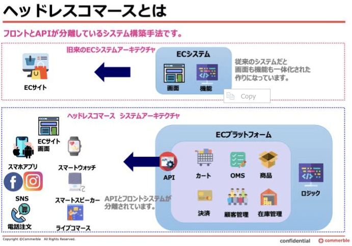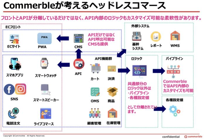 ECのAPI化、柔軟なAPI呼び出しが出来ることは非常に有用です。ただ、単純にフロントとバックエンド分けることだけを考えてしまうと、サービスベンダーが分かれたり、データの保存場所が分かれたり、処理の詳細まではカスタマイズできなかったり等いくつか問題があります。 Commerbleでは上記問題点をカバーしたヘッドレスコマースを包含し、超えるようなアーキテクチャを保有しています。